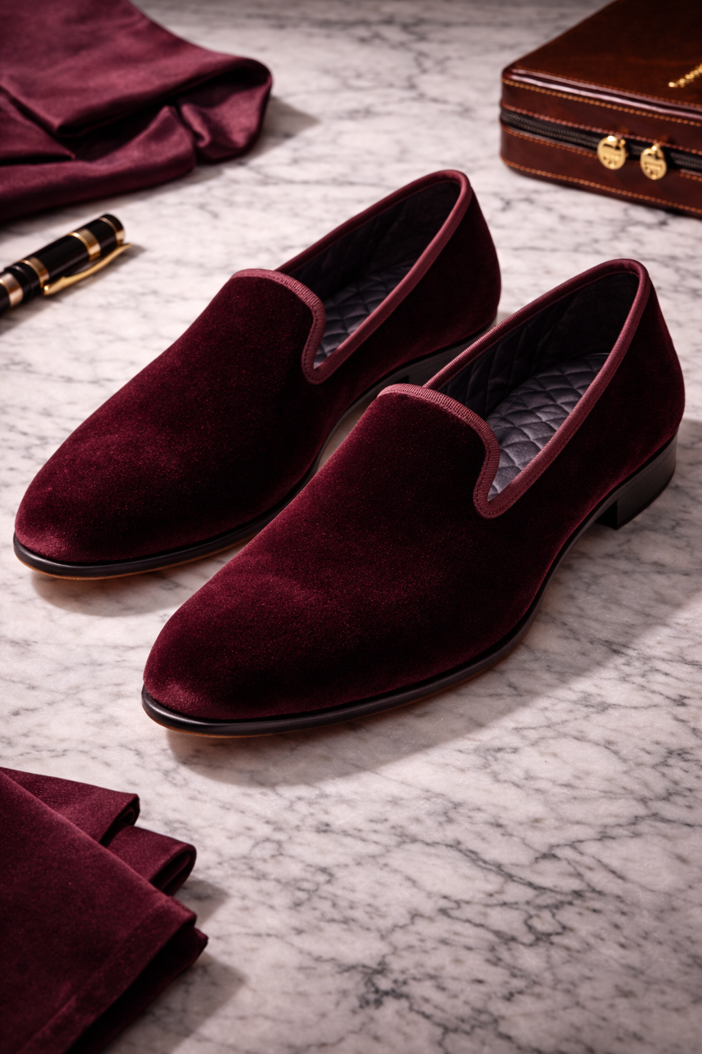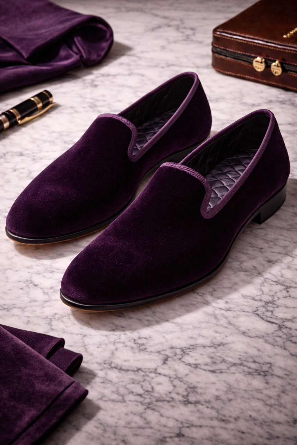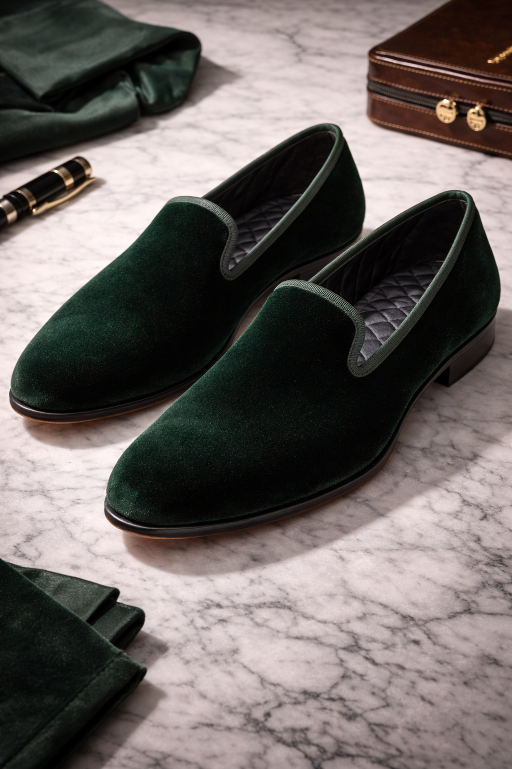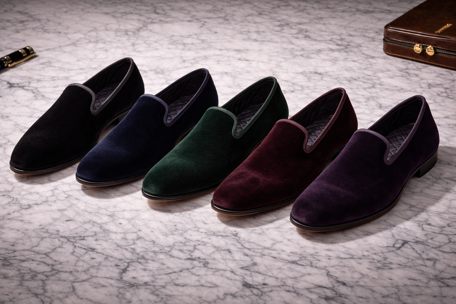 For occasions that demand a departure from standard leather footwear, the velvet loafer offers a touch of opulence and historical charm. These loafers are crafted from a dense, high-pile cotton velvet that provides a rich, light-absorbing texture. The edges are finished with a tonal grosgrain ribbon, a traditional detail that prevents the velvet from fraying and adds a subtle contrast in sheen.